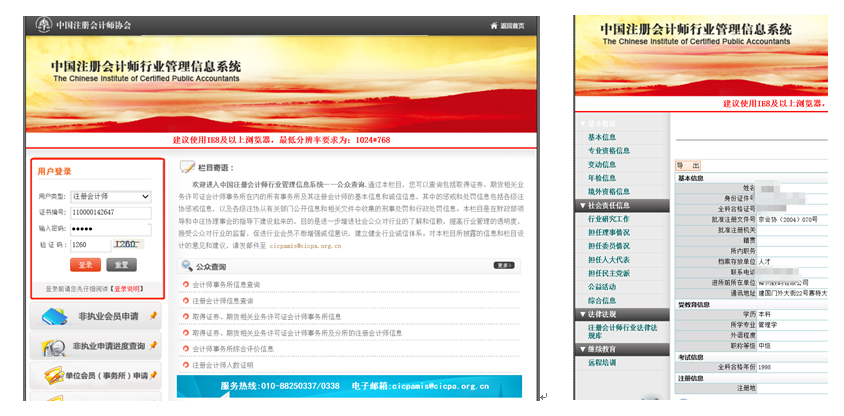 注册会计师在IE浏览器中访问行业管理信息系统(会员版)(网址:http://cmispub.cicpa.org.cn/cicpa2_web/),在如下登录页面选择用户类型“注册会计师”,输入会员证书编号、密码、验证码后,点击登录,进入首页。