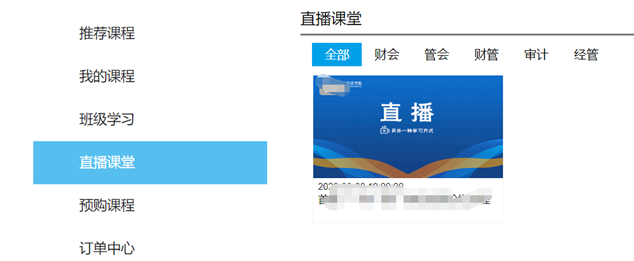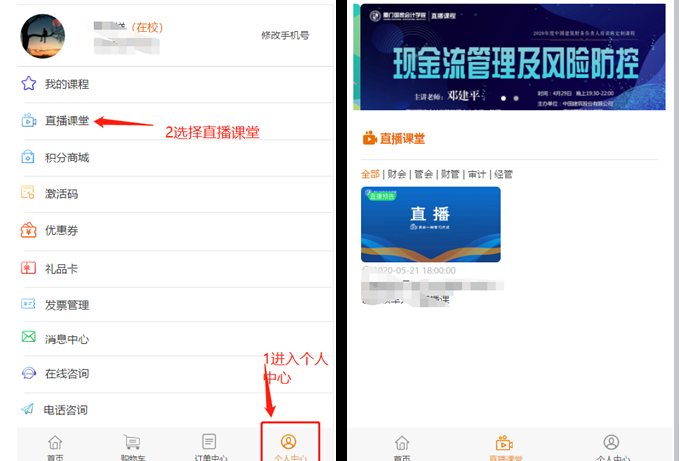 点击进入“个人中心”,选择“直播课堂”。如下图所示: