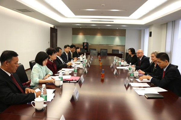 2016年5月23日,中国注册会计师协会会长冯淑萍女士(左三)会见来访的国际会计师联合会(IFAC)主席奥利维亚·科特利女士(Ms. Olivia Kirtley)(右二)一行,中国注册会计师协会副会长兼秘书长陈毓圭(左四)、中国注册会计师行业党委副书记杨晨辉(左五)等参加会见。