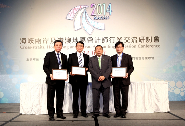 澳门会计专业联会崔世昌会长(右二)向研讨会主题演讲嘉宾中注协副会长兼秘书长陈毓圭(左二)、香港会计师公会行政总裁丁伟铨(右一)、台湾省会计师公会主任委员戴兴钲(左一)赠送纪念证书并合影