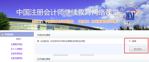 进入“中国注册会计师协会继续教育网络课堂”首页,选择直播课堂第七期,点击“提交报名”,显示“报名成功”,即完成培训报名。