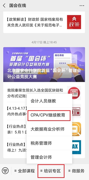 关注北京国家会计学院官方公众号“国会在线”,点击“培训专区”选择“CPA/CPV教育专区”,进入“中注协网络课堂”,后续操作步骤同电脑端报名。