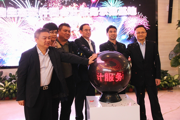 中国注册会计师协会副秘书长杨志国(右三)、海南省财政厅总会计师吴和平(右二)、海南省工业和信息化厅副厅长林敏(右一)、澄迈县委副书记、老城经济开发区工委书记莫仲敏(左三)、澄迈县副县长孔丽(左二)、海南生态软件园投资发展有限公司总经理杨淳至(左一)共同为基地揭牌