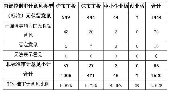 在1530份内部控制审计报告中,非标准内部控制审计报告86份,占5.62%,非标报告的数量和比例都较2014年度(78份,比例为5.32%)有所上升。