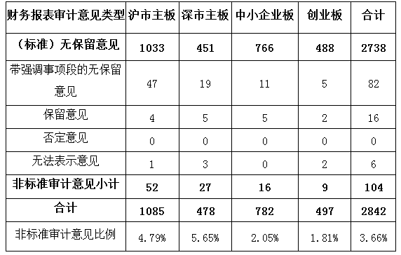 人民网北京5月20日电 (吕骞)中国注册会计师协会近日发布的上市公司2015年年报审计情况快报显示,在2842份财务报表审计报告中,非标准财务报表审计报告104份,占3.66%,非标报告的数量较2014年度(98份)有所上升,非标报告比例与2014年度(3.67%)基本持平。