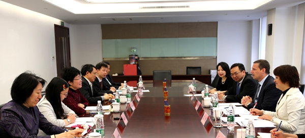 2015年4月14日,中注协会长冯淑萍(左三)会见澳洲会计师公会首席运营官杰修思先生(Mr. Jeff Hughes)(右二)一行,中注协副会长兼秘书长陈毓圭(左四)、中国注册会计师行业党委副书记杨晨辉(左五)参加会见。