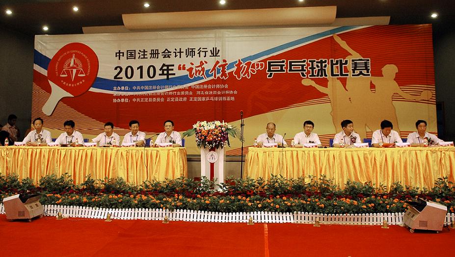 2010年8月25—27日,中国注册会计师行业2010年“诚信杯”乒乓球比赛在乒乓球世界冠军的摇篮——河北正定国家乒乓球训练基地隆重举行。中国注册会计师协会会长刘仲藜寄语比赛“弘扬国球精神,铸就行业诚信”,出席开幕式并致词。河北省委副书记、省长陈全国为比赛发来贺信,省委副书记、常务副省长付志方出席开幕式,并宣读陈全国省长贺信。河北省财政厅党组书记、厅长齐守印致欢迎词。中国注册会计师行业党委常务副书记、中注协秘书长陈毓圭主持开幕式。