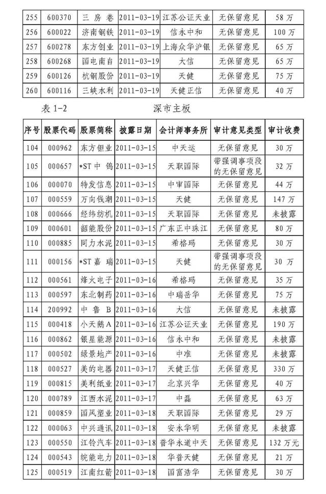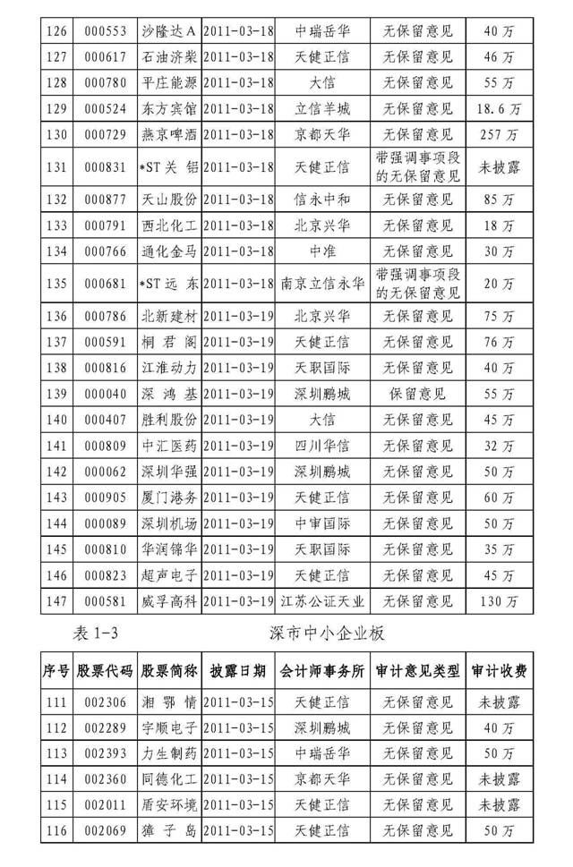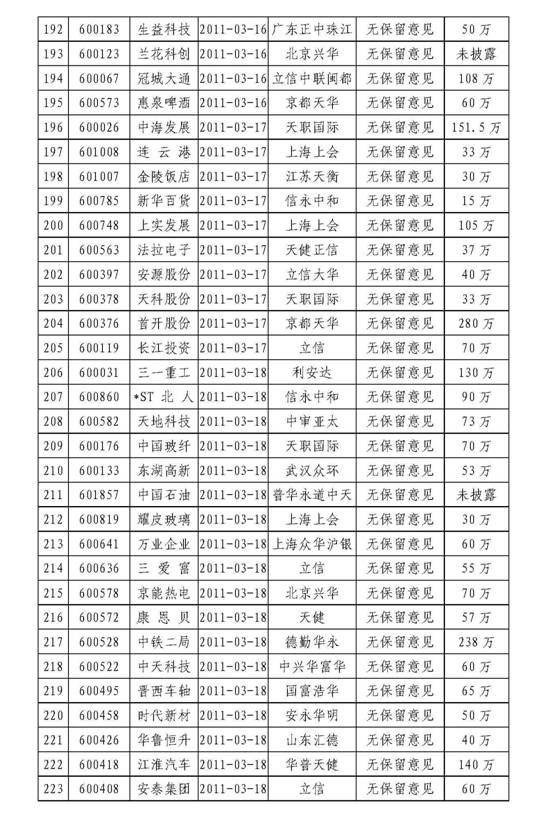 截至3月20日,会计师事务所共为627家上市公司出具了审计报告(详见附表2)。其中,无保留意见审计报告598份,带强调事项段的无保留意见审计报告24份,保留意见审计报告5份。在已披露2010年年报的627家上市公司中,A+H股公司7家(中国铝业、皖通高速、经纬纺机、中海发展、中国石油、中兴通讯和*ST北人)。