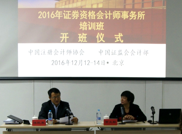 2016年12月12—14日,中国注册会计师协会与中国证监会会计部在北京国家会计学院联合举办2016年证券资格会计师事务所培训班。中国证监会首席会计师贾文勤、中注协秘书长陈毓圭出席开班式并讲话。
