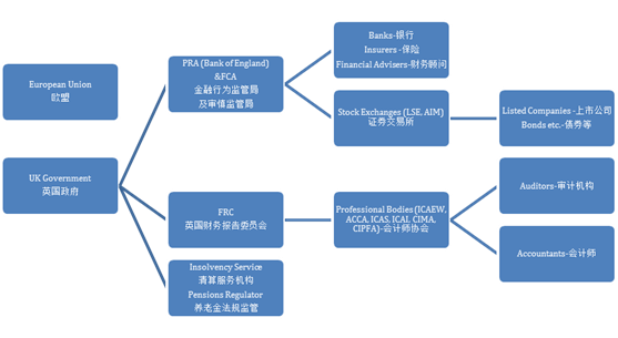 通过注协的积极沟通,我们拜访了除爱尔兰外的五家英国会计师协会及其监管机构,英国金融及审计监管相关机构如下图: