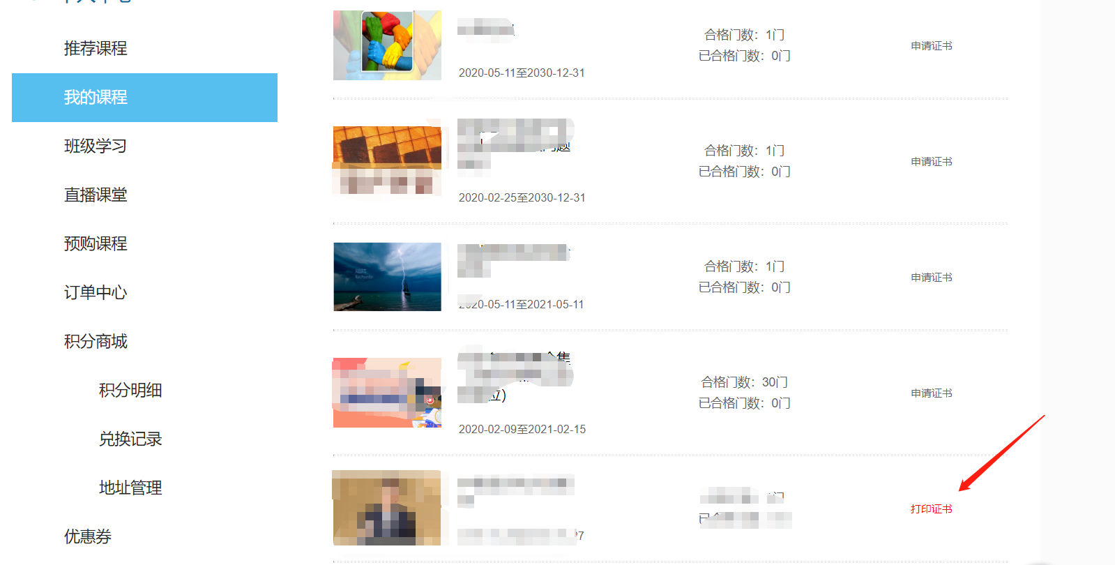 进入我的课程选择可申请证书课程进行证书申请,待管理审核通过后即可打印证书。
